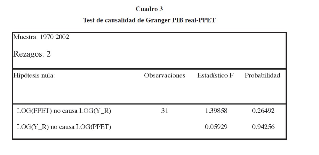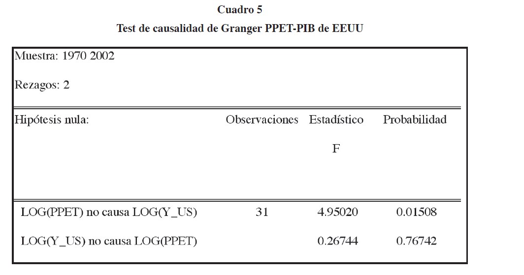 El coeficiente del PIB de Estados Unidos es estadísticamente no significativo debido, probablemente, a que podría estar fuertemente correlacionado con los PPET, según muestra la prueba de causalidad estadística de Granger que revela la existencia de una relación de causalidad entre los PPET y el PIB de Estados Unidos.