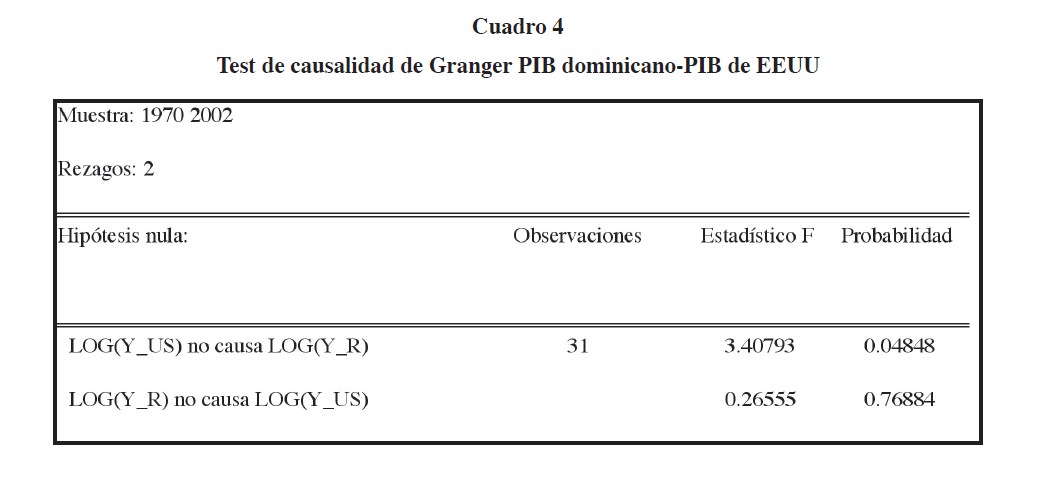 Otra variable importante, incluida en esta estimación es el PIB de los Estados Unidos, cuya causalidad estadística en el PIB dominicano se verificó mediante la prueba de Granger. El coeficiente obtenido para esta variable implica que ante un aumento de un punto porcentual del PIB de Estados Unidos, el PIB dominicano aumenta en 0.20 puntos porcentuales. Vale destacar que las variables incluidas resultaron no estacionarias, pero al analizar los residuos, se obtiene una relación de largo plazo que cointegra.