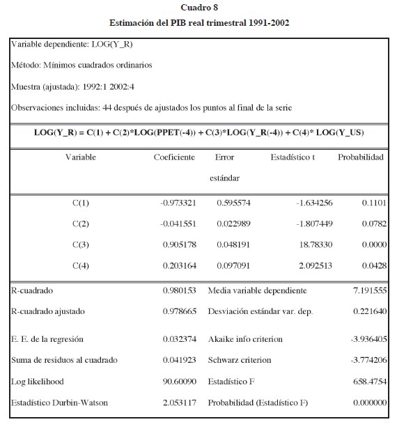 La relación estimada con series trimestrales para el período 1991-2002, explica la variación del producto interior dominicano utilizando como variables explicativas los precios del petróleo y el PIB real dominicano, rezagados en cuatro períodos, así como el PIB estadounidense en el período corriente. La relación corresponde a la forma funcional representada por la ecuación (3) con sus coeficientes computados. Los resultados detallados de la regresión se presentan en el cuadro 8 en el anexo.