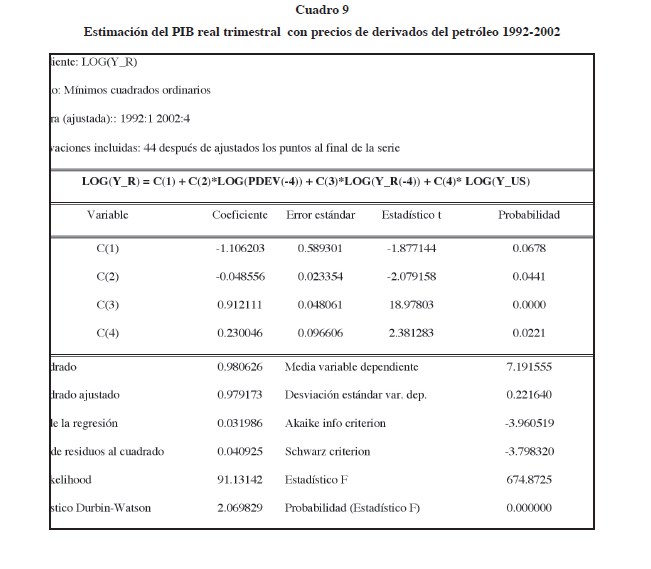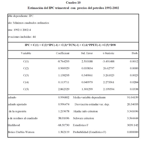 Esto implica que cuando el precio del barril de petróleo en el mercado internacional aumenta en un dólar en un trimestre, el IPC aumenta en 0.1137 unidades. Puede notarse que la incorporación del aumento del precio internacional del petróleo a los precios locales es con rezago de un trimestre. Esto puede explicarse, porque éste no sólo entra en el índice de precios con sus productos derivados, sino que también indirectamente a través de los precios de los productos que utilizan estos derivados como insumos para el proceso de producción, y estos tardan más en reflejarse en el IPC.