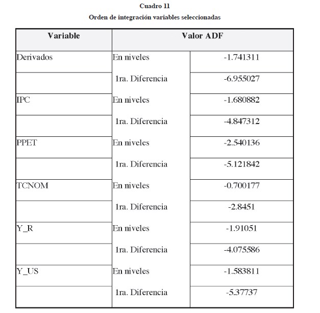 - En los cuadros 10 y 11 del anexo se presentan los resultados de las pruebas de raíz unitaria para las variables en logaritmo y para el residuo de la ecuación de largo plazo.