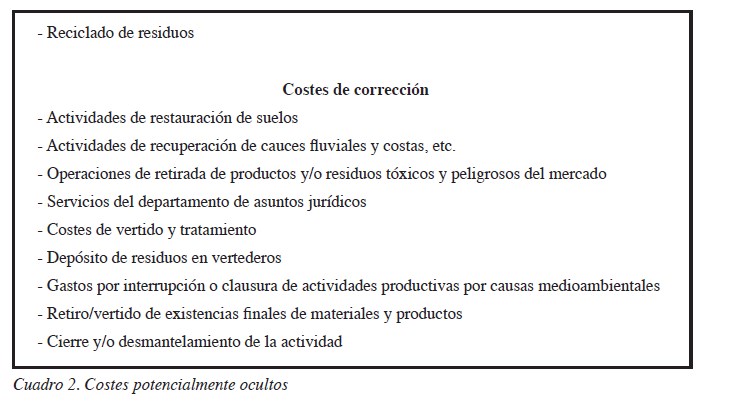 Es obvio que, además de los expuestos, existen otros conceptos de gasto por naturaleza repartidos por la cuenta de resultados cuyo contenido medioambiental, aunque indudable, permanece invisible debido a las técnicas de registro seguidas. Son las partidas que, en la terminología de la USEPA (1995b), se califican de potencialmente ocultas. Es el caso de costes cuantificables que generalmente están relacionados de manera indirecta con la política ambiental de la compañía aunque formando parte de las medidas adoptadas por la empresa en dicha materia, sea voluntariamente o en cumplimiento de las normas legales. El apelativo de ocultas obedece a que no están directamente relacionadas con materiales, procesos o productos específicos, pudiendo ser su magnitud de difícil determinación debido a su inclusión indiferenciada en las cuentas de gastos generales. Todos estos costes cumplen la definición de medioambientales y sin embargo no son reconocidos como tales en la cuenta de resultados, y es posible que ni siquiera se incluyan en las notas a los estados financieros, salvo que se disponga de un adecuado sistema de captación y tratamiento de datos. En el Cuadro 2 se exponen algunas posibles partidas ocultas susceptibles de consideración como medioambientales.