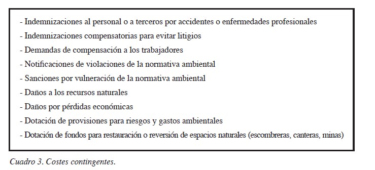 Los dos primeros casos aluden a sanciones legales, costes de limpieza, sean por actividades pasadas o presentes, y demandas por daños personales causados a empleados o ciudadanos en general, así como a la propiedad. Estos conceptos, si bien responden a la idea de resarcir o compensar al entorno, las personas y sus propiedades por los daños sufridos, son consecuencia de la elusión, por parte de la empresa, de sus compromisos de prevenir, corregir o reducir el daño ambiental. Por su parte, los gastos de responsabilidad contingente tratan de hacer frente a acontecimientos futuros o inesperados que puedan suponer daños al medio ambiente o bien a terceros y sus propiedades, sean accidentales o intencionados, debido a un incumplimiento de sus obligaciones legales y/o contractuales por parte de la compañía, no siendo compensados por otras vías. Su reconocimiento contable se produce en términos probabilísticos dado que pueden o no ocurrir en algún punto del futuro.