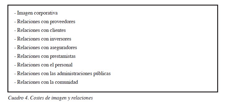 En el Cuadro 4 se enumeran algunos costes asociados a la imagen y relaciones con grupos de interés.