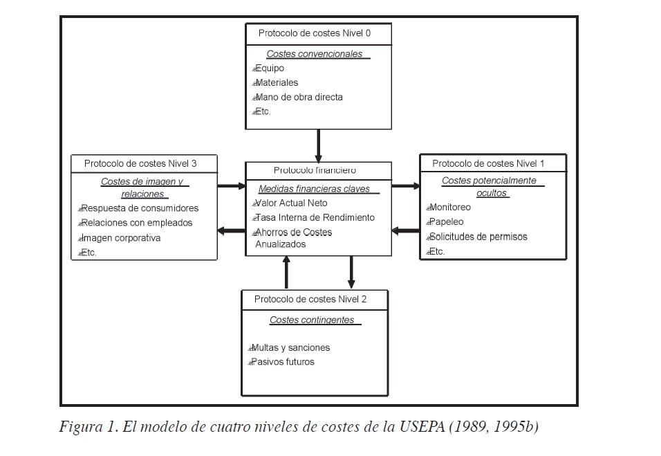 Una de las metodologías más conocidas de clasificación de costes ambientales es el protocolo de cuatro niveles de costes de la USEPA (1989), que distingue desde los costes usuales (Nivel 0), fácilmente identificables hasta aquellos que son intangibles por naturaleza y difíciles de medir (Nivel 3), pasando por los costes ocultos (Nivel 1) y los costes por pasivos (Nivel 2). En una propuesta posterior (USEPA, 1995b), tales niveles de costes pasarían a denominarse, respectivamente, costes convencionales (Nivel 0), costes potencialmente ocultos (Nivel 1), costes contingentes (Nivel 2) y costes de imagen y relaciones (Nivel 3).