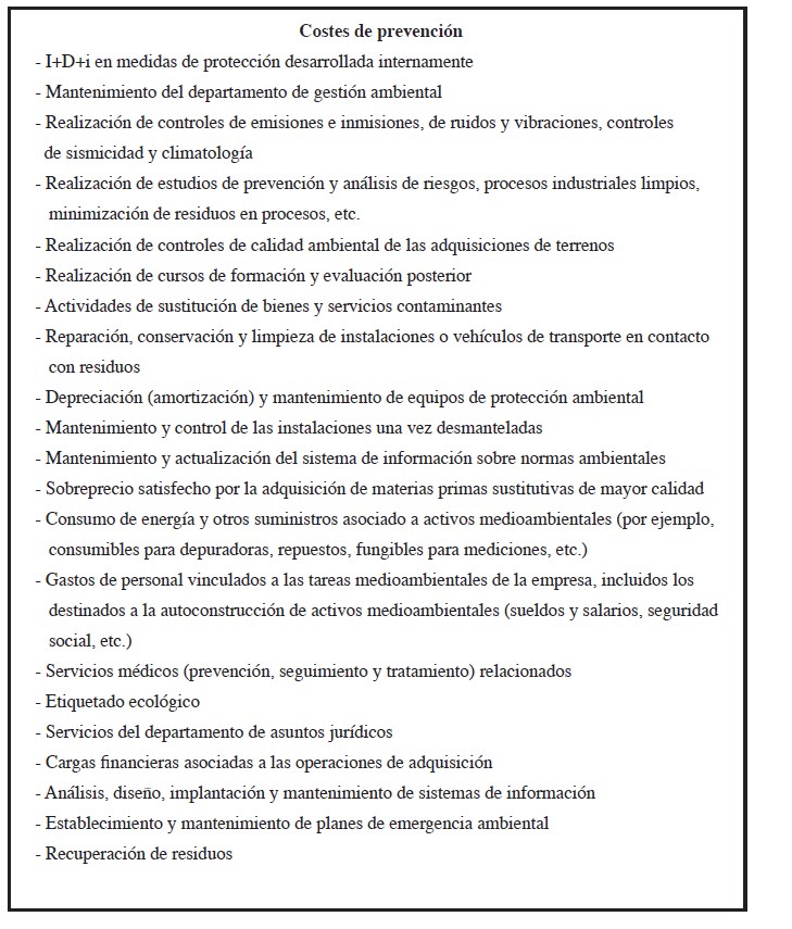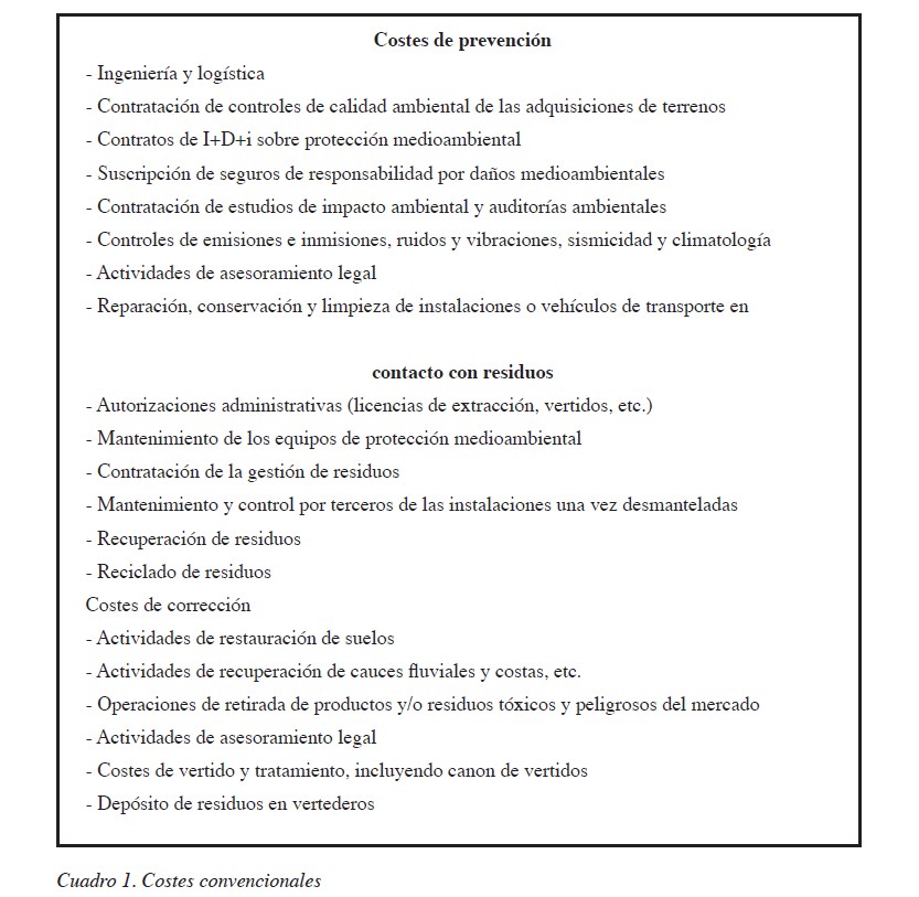 Si se considera en sentido estricto las definiciones usuales de gastos medioambientales, la identificación y medida de las partidas susceptibles de consideración como tales es razonablemente sencilla, siendo asimilables a lo que comúnmente se denomina “Servicios exteriores”. A título ilustrativo, en el Cuadro 1 se expone una posible relación de tales partidas, distinguiendo entre costes de prevención y costes de corrección.