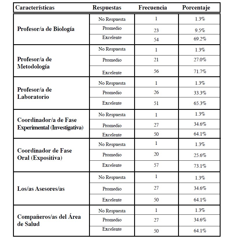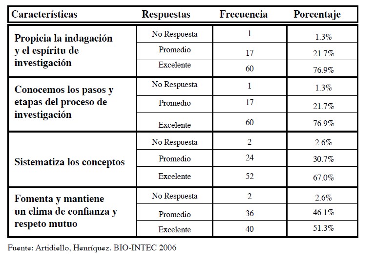 Otras de las variables que fueron objeto de estudio en la presente investigación, es la experiencia académica que alcanzaron los/as estudiantes al participar en el proyecto del BIO‐INTEC. Según el orden jerárquico de los porcentajes obtenidos, en cuanto a las características que se tuvieron en cuenta para contactar las experiencias académicas, con la valoración de excelente dada por los/as estudiantes con un 76.9% las variables de Propicia la investigación y el espíritu de investigación y conocen los pasos y etapas del proceso de investigación, un 67.0% para la sistematización de conceptos y por último es seleccionada la característica de fomenta y mantiene un clima de confianza y respeto mutuo, representando un 51.3% .