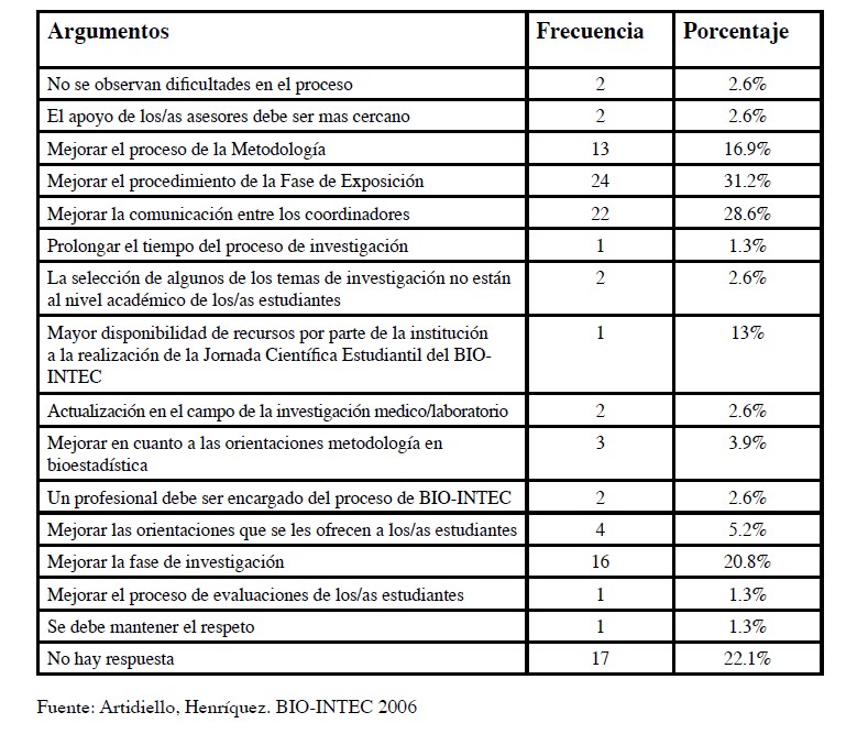 Los aspectos del proceso del BIO‐INTEC que merecen cambios según los/as estudiantes, de acuerdo a la cantidad de veces que se repiten son: en primera fila, se recomienda mejorar el procedimiento de la Fase de exposición, la comunicación entre los coordinadores, la fase de investigación y el proceso de la metodología. Sin embargo uno o dos estudiantes recomendaron lo siguiente: el apoyo de los/as asesores/as debe ser más cercano, la selección de algunos de los temas de investigación no están al nivel académico de los/as estudiantes, mejorar en cuanto a las orientaciones que en la metodología en Bioestadística se les ofrecen a los/as estudiantes, actualización en el campo de la investigación medico‐laboratorio y un profesional debe ser encargado del proceso del BIO‐INTEC.