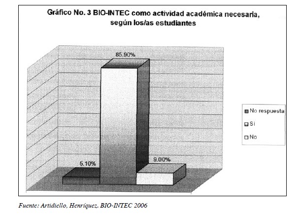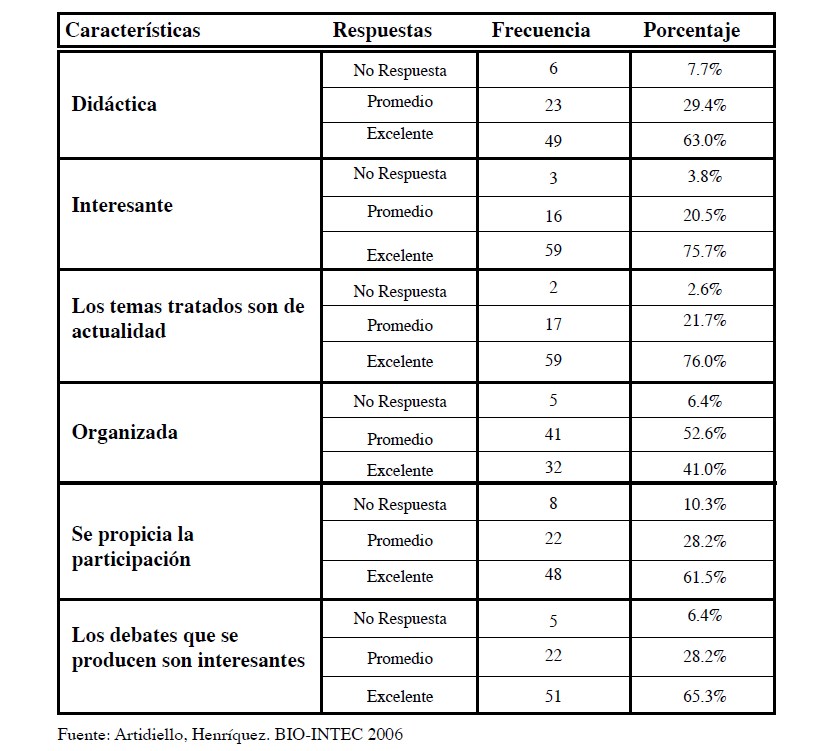 “El BIO‐INTEC es una oportunidad grandiosa para aprender a desarrollar un trabajo de investigación y, durante años, se ha realizado con mucho éxito; de todos modos, debemos recordar que estos muchachos apenas están comenzando sus estudios de medicina y los temas que se les debe dar deberían ser temas sencillos de áreas epidemiológicas de la medicina, ya que actualmente prefieren no orientarse a temas de biología en general”.
