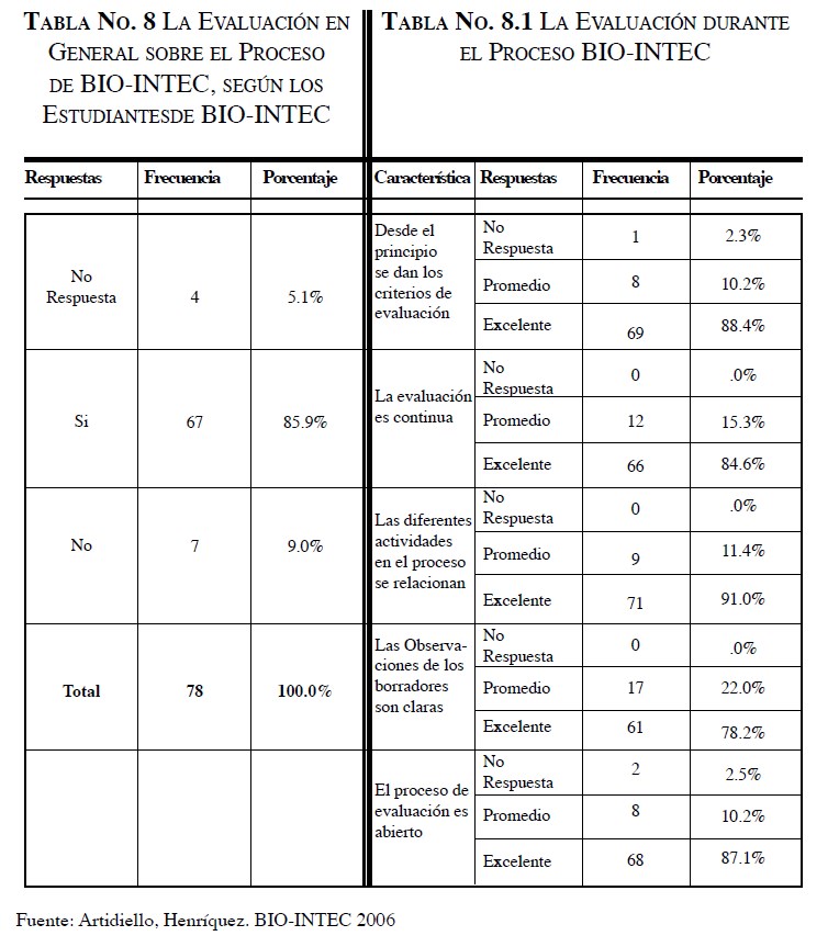 En cuanto a la evaluación en general del proceso del BIO‐INTEC 64 de 78 de los/as estudiantes informantes consideraron excelente el proceso, representando el 85.9 %. Además los/as estudiantes expresan sus criterios sobre el proceso de evaluación de BIO‐INTEC, todos los indicadores a evaluar, según porcentaje, es superior al 75%. El porcentaje que resulta más bajo es en el indicador sobre las observaciones de los borradores: son claras con un 78.2%. Estos resultados nos avisan que tenemos que prestar más atención a las observaciones de los trabajos de investigación de los/as estudiantes. Ahora bien, la característica de: Las diferentes actividades en el proceso se relacionan es considerada con un 91.0 %. Desde el principio se dan los criterios de evaluación, es valorado con un 88.4% y El proceso de evaluación es abierto, con un 87.1%. Estos resultados nos reafirman que es muy importante informar de forma oportuna, clara y precisa a los/as estudiantes desde un principio, en qué consiste el sistema de evaluación durante el proceso. Todos los resultados que se observan en las Tablas No. 8 y 8.1 indican que el proceso de evaluación es satisfactorio, además, se confirma que en todo proceso académico según el enfoque constructivista, las pautas y criterios de evaluación deben estar claramente establecidos para que éstas permitan valorar de forma transparente y continua la construcción del conocimiento, favoreciendo a que se logre un aprendizaje significativo en relación a los contextos.