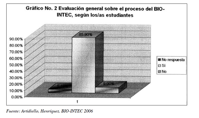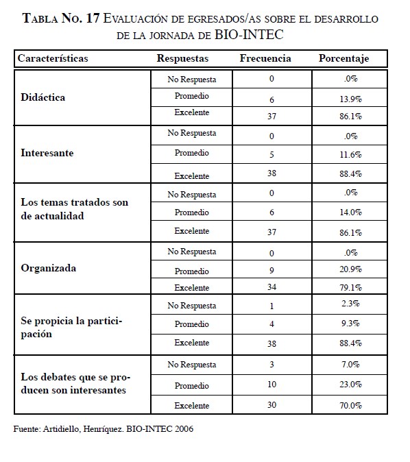 Los/as estudiantes han expresado su excelente evaluación tanto a la jornada del BIO‐INTEC como al proceso de la realización del BIO‐INTEC y en ambos casos también han ofrecido muy buenas recomendaciones, por ello es que se manifiestan de forma similar, para expresar su interés solidario en participar en las diferentes coordinaciones y comités que permite la organización y realización del proyecto del BIO‐INTEC.