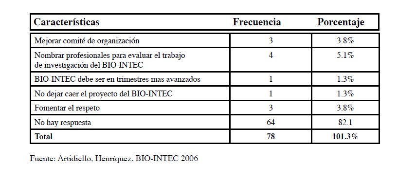 Esta tabla recoge la información sobre la respuesta a la pregunta ¿Se considera el proyecto de BIO‐INTEC una actividad necesaria, que debe seguir realizándose? Los/as estudiantes consideran que debe seguir desarrollándose, pero aportan algunas sugerencias, como son: Nombrar únicamente profesionales para evaluar el trabajo del BIO‐INTEC, Mejorar el comité de organización, Fomentar el respeto mutuo, y el BIO‐INTEC debe desarrollarse en un trimestre más avanzado.