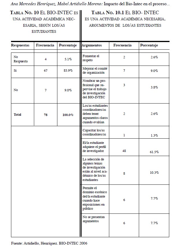 El/la estudiante adquiere un perfil de investigador, Introduce al/el estudiante en el mundo científico de la medicina, Permite el dominio escénico del/la estudiante cuando hace exposición en público. Por otra parte, en menor porcentaje, los/as estudiantes plantean que el BIO‐INTEC, Ayuda al estudiante a reafirmar su vocación de médico, y la actividad de la Jornada Científica Estudiantil de BIO‐INTEC debe ser tomada en cuenta tanto para las carreras de Ingeniería, Negocios y otras, Los/as estudiantes coordinadores/as deben tener argumentos claros cuando Evalúan, Mejorar el comité de organización, Nombrar un profesional que supervise el trabajo de investigación del BIO‐INTEC y Capacitar los/as coordinadores/as. Como se observa en las tablas 10 y 10.1.
