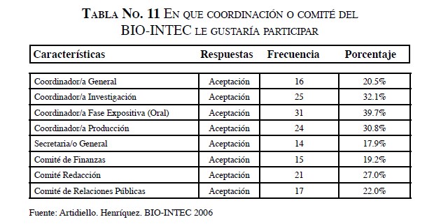El hecho de que los/as estudiantes desean participar en el proceso del BIO‐INTEC como orientadores y organizadores de este revela que desean seguir aprendiendo de los pasos y etapas del trabajo de investigación. Lo que refleja la tabla no. 11