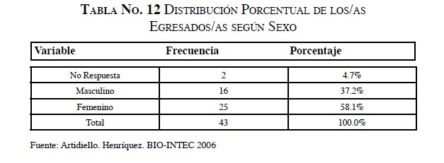 En cuanto a los/as egresados/as tenemos una representación correspondiente a 12 años, que comprenden, de forma continua desde el año 1993 hasta el año 2006, excluyendo el año 1999 y 2000. En total tenemos una representación que comprende 43 egresados/as, para mas detalle observar la tabla no. 13.