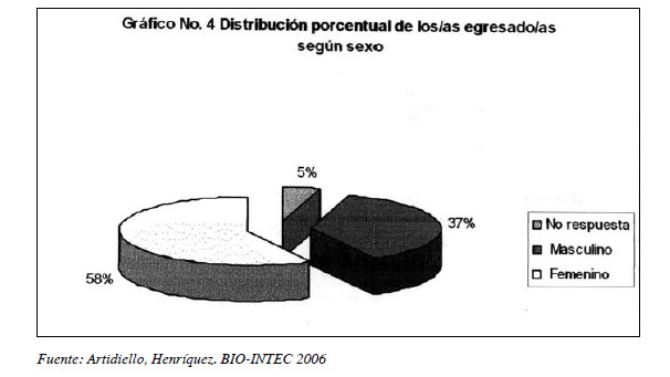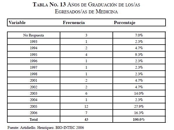 Por otra parte, observamos los años en que se graduaron los/as egresados/as, que han colaborado en responder el instrumento de cuestionario abierto: estos comprenden los años desde 1993 hasta el 2006, aspecto que resulta significativo pues aunque el programa del BIO‐INTEC comenzó en el año 1983 realmente esta actividad toma fuerza a partir de los años 90s, ya que los temas de investigación se refieren a investigaciones de contenidos médicos, elemento que ha hecho de esta actividad académica una prueba de vocación y de capacidad de trabajo del/la estudiante de la carrera.