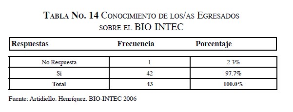 Al observar Tabla No.14. El grupo de egresados/as que forma parte de la representación de la población de la carrera de medicina del INTEC objeto de la presente investigación, de 43 egresados/as, 42 respondieron afirmativamente a la pregunta ¿Conoce Usted qué es BIO‐INTEC?, lo que representa un 97.7% en relación a la totalidad abordada. Estos datos expresan que son muy pocos de los/as egresados/as de medicina que no participan de esta actividad académica.