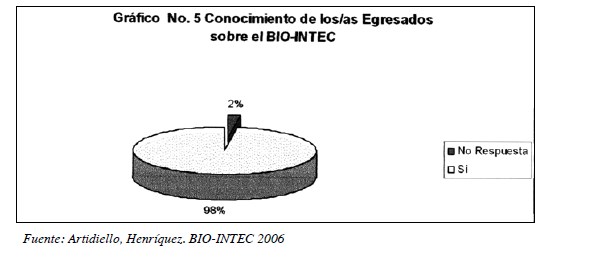 En cuanto a los aspectos del proceso de BIO‐INTEC que merecen cambios 12 de los/as 43 egresados/as considera que no es necesario hacer cambio. Ello constituye el 27.9%, y 5 de los/as egresados no ofrecen respuesta, lo que representa el 39.5% de la muestra representativa. Esto implica que el programa tiene una aceptación favorable, pero no podemos cerrar los ojos antes las pequeñas debilidades del proceso, debemos seguir trabajando en aras de un mejor desenvolvimiento y prestar atención a lo que se nos recomienda, como es trabajar más de cerca en: la selección de algunos de los temas de investigación que no están acordes al nivel académico de los/as estudiantes, mejorar la metodología del proceso de investigación, fundamentalmente en el análisis estadístico, mejorar el procedimiento de la fase expositiva en cuanto al trato con los/as estudiantes, el apoyo de los/as asesores debe ser más cercano, mejorar comunicación entre los/as coordinadores.
