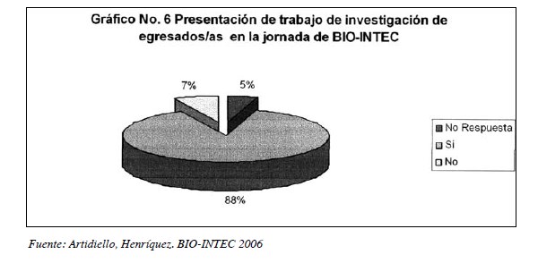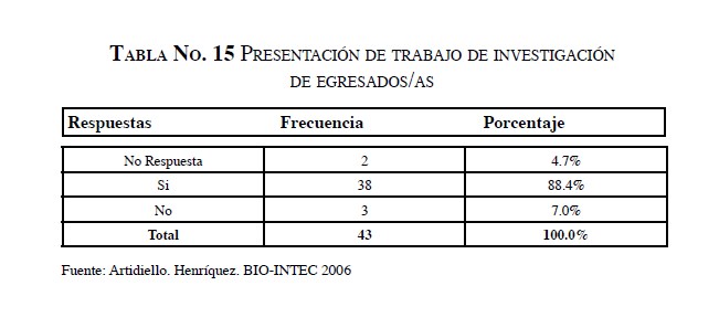 En esta tabla se observa que de 43 egresados/as, 38 presentaron un trabajo de investigación en las Jornadas Científicas Estudiantiles del BIO‐INTEC, lo que representa el 88.4%. Este es un resultado interesante, ya que inferimos que aproximadamente todo/a estudiante de la carrera de medicina en el INTEC realiza y presenta un trabajo de investigación, en su primer año de estudio. Los/as egresados/as que no realizan esta actividad es porque son transferidos de otras universidades y generalmente convalidan la asignatura de Biología, en donde se orienta y coordina todas las actividades correspondientes al programa del BIO‐INTEC.