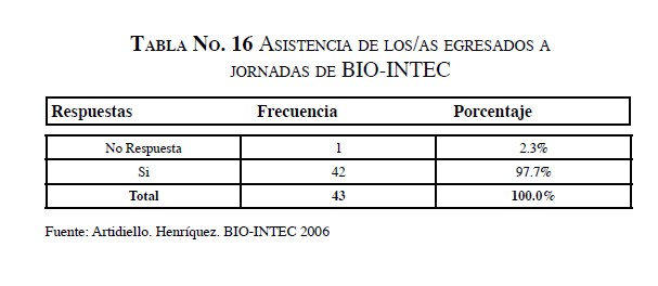 La asistencia a la Jornada Científica Estudiantil del BIO‐INTEC por parte de los/as egresados/as, objeto de investigación, es casi la totalidad, pues de 43 egresados/as, asistieron 42 por lo que constituye el 97.7% .Esto refleja que esta actividad académica ha recibido un apoyo casi total de los/as egresados/as.