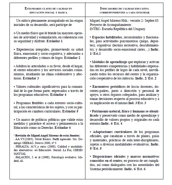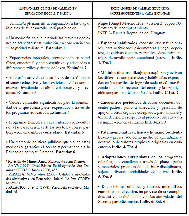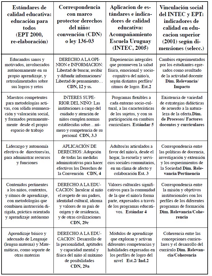 Una segunda aproximación, que se suma a la articulación de EPT y Derechos de la Niñez en nuestra lectura matricial lo aporta, en una tercera columna, el filtro de la experiencia de formular estándares e indicadores de calidad educativa a la luz de la propia práctica. Como modelo aplicado en este sentido, ofrecemos el formulado en el año 2004 como marco referencial (v. anexo) del acompañamiento desarrollado desde el INTEC a la escuela República del Uruguay, en el Distrito educativo 15-03 de Santo Domingo. Este acompañamiento es retroalimentado desde el practicum de la electiva Derechos de la Niñez en la práctica profesional.