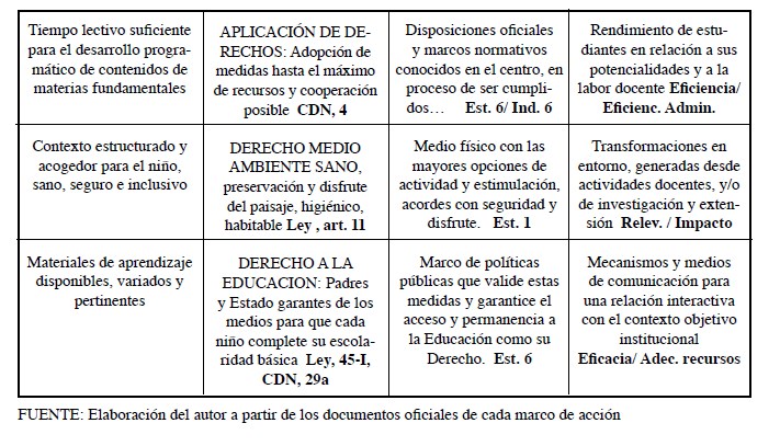 Por este motivo, la síntesis que ofrece el cuadro que acompaña estas líneas, sitúa en segundo lugar de la lectura matricial, los contenidos de la Convención y de la Ley 136-03 (que aplica esta Doctrina jurídica de Niñez en República Dominicana), como “filtro” de pertinencia de los estándares de Educación para Todos. Esta metodología permite corroborar hasta qué punto nuestros horizontes educativos pretenden ser ejecutores de Derechos.
