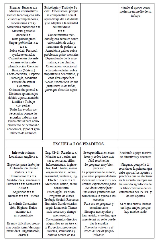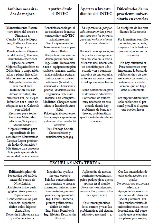 En cuanto a los contenidos de esta vinculación universitaria, los testimonios reflejan el desarrollo de aportes coyunturales u “operativos” de recursos materiales (donación de freezer para la leche del desayuno escolar, juguetes y ropa a NNA, Los Praditos; medicinas y recogida de basura, F.R. Pané), y de algunos recursos formales (charlas de orientación vocacional en el Liceo Ntra. Sra. del Carmen e Instituto Yodi; charlas y animación con cartelones, Fray R. Pané). También en la escuela F. R. Pané se cita expresamente el aporte de la formación a maestros/as desde el INTEC, y el uso de la biblioteca de nuestra universidad. En el caso de la UTE, se la cita en relación a las 60 horas de servicio social de estudiantes de Nivel Medio.