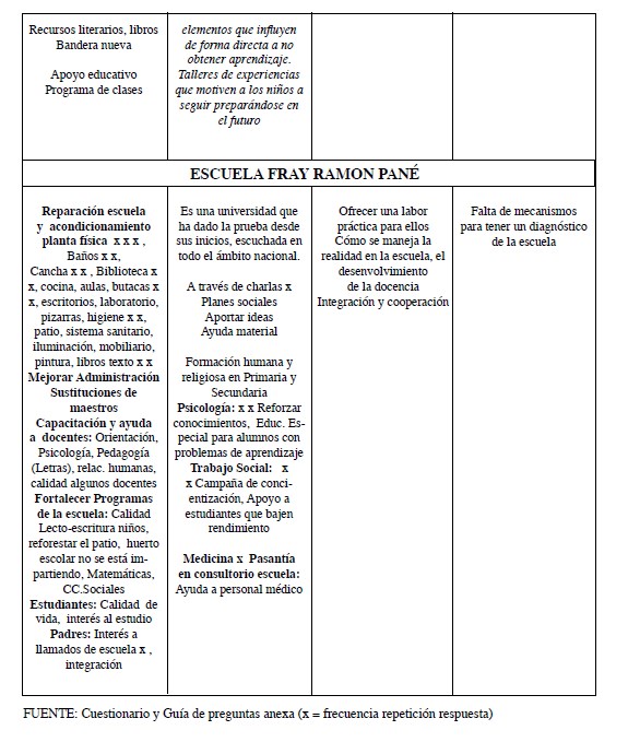 Estas presentan alternadamente, para cada escuela, el discurso de las personas adultas seguido del de los/as estudiantes, niños, niñas y adolescentes (NNA). En el caso de las personas adultas de las escuelas, la primera columna de la matriz recoge los aportes de la primera pregunta de la entrevista, y de la primera y segunda del cuestionario (v. anexos). La segunda columna recoge aportes de la segunda pregunta del cuestionario. Las dos últimas columnas de la matriz recogen los datos, respectivamente, de la preguntas 3 y 5 de la guía de entrevistas.
