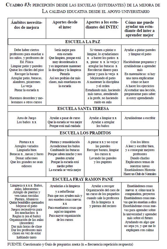 En el momento de llevarse a cabo la aproximación a las escuelas de la muestra, los/as estudiantes del INTEC y el investigador no coincidieron con ninguna iniciativa universitaria, como las que se citan, ni evidencias de un acompañamiento sistemático en este sentido.