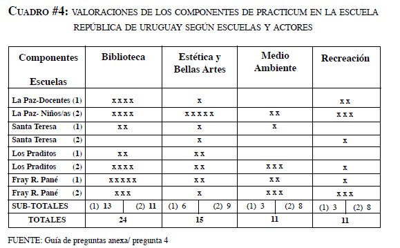 La respuesta a la pregunta 4, de las guías utilizadas en las entrevistas a personas adultas y a NNA, en relación a aspectos de interés del practicum desarrollado en la escuela República del Uruguay, se sintetiza en un cuadro adicional a estas matrices principales.