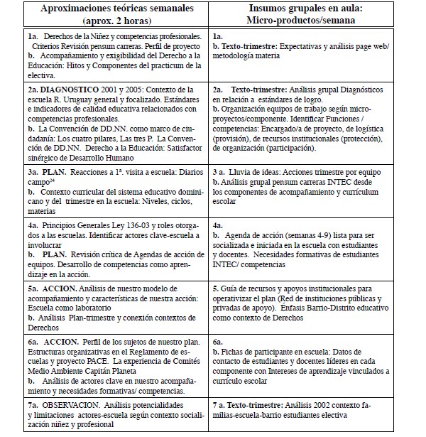 Como provocación de la reflexión en torno a las competencias a definir para un practicum del INTEC en escuelas, se elaboró un documento base (v. anexo), en mayo de 2005, que orientara a los/as estudiantes de la electiva Derechos de la Niñez en la práctica profesional, acerca del salto teórico‐práctico planteado. Dicho documento presenta una propuesta de competencias típicas, agrupadas por Areas, y fue sometido a la reflexión de los/as estudiantes participantes en la electiva.