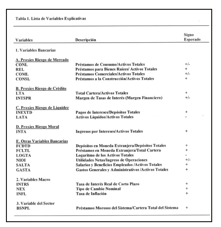 Siguiendo el método utilizado por Ahumada y Budnevich (2001) donde como medida de fragilidad e identificación de problemas en el sistema bancario se utiliza la tasa de morosidad (relación entre los préstamos morosos y la cartera total), debe señalarse que la tasa de morosidad identifica como bancos con problemas a aquellos con mayor proporción de préstamos morosos en sus carteras. Estudios previos han utilizado también la tasa de cobertura del banco. Esta se define como la relación entre la suma del capital accionario más las reservas por pérdidas en cartera menos los préstamos morosos dividido entre el total de activos.
