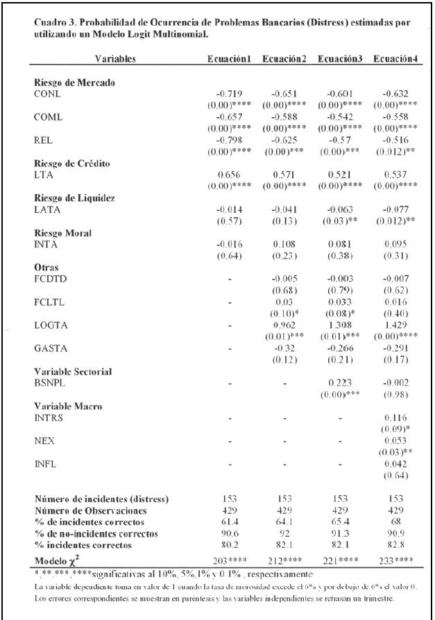 Para estimar la probabilidad de de que un banco enfrente problemas un modelo logit para datos de panel fue utilizado. Los resultados del análisis indicaron que una elevada relación de préstamos morosos, con relación al total de activos, y una reducida razón capital sobre el total de activos son fuertes indicadores sobre futuros problemas bancarios. En adición, riesgo de mercado y riesgo de liquidez son generalmente importantes en determinar problemas bancarios o quiebra eventual.
