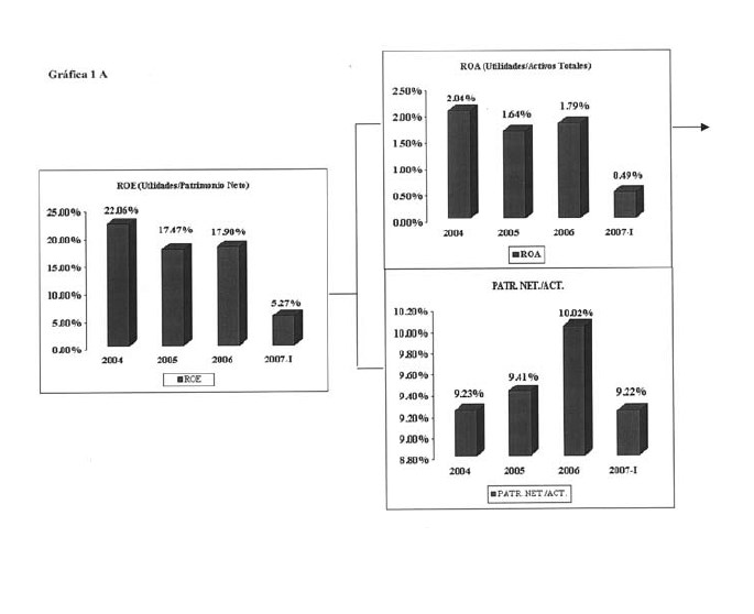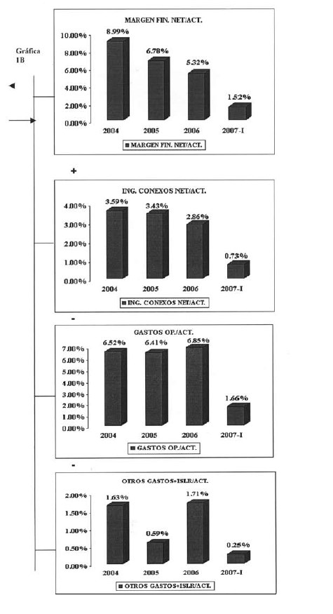 Para dar una idea de la situación de la banca comercial, después de los eventos del 2003, la Gráfica 1 anexa al final del artículo muestra un árbol de rentabilidad de la banca comercial (2004-2007I); en la cual se descompone la rentabilidad sobre el capital dividiendo el retorno sobre los activos entre el índice calculado como la relación entre el patrimonio neto sobre el total de activos. En el extremo derecho de la Gráfica, se resumen los principales componentes del retorno sobre activos en la sumatoria de las partidas principales del estado de ingresos y gastos, partiendo del margen financiero. Las partidas se han dividido por el total de activos.