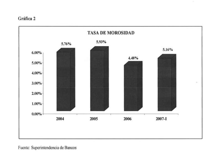 En lo concerniente a la tasa de morosidad, los niveles registrados para el período 2004-2007I, se presentan en la Gráfica 2 anexa al final del artículo. Aunque los valores observados son inferiores a la cifra registrada en el 2003; los mismos se mantienen por encima de las tasas de morosidad observadas antes del 2003. La tasa de morosidad observada en el 2002 fue 4.9%. Tasas de morosidad muy cercanas a los márgenes de intermediación podrían ser señales de posibles futuros problemas de liquidez en la banca.