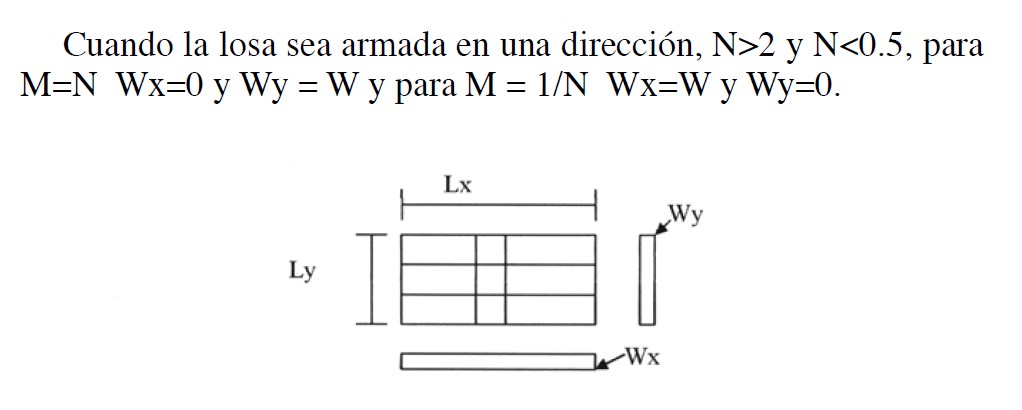 Se llamará W a la carga total factorizada actuante y Wx a la porción de la carga total actuante en la franja en la dirección X, y Wy a la porción de la carga total actuante en la franja en la dirección Y.