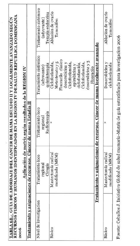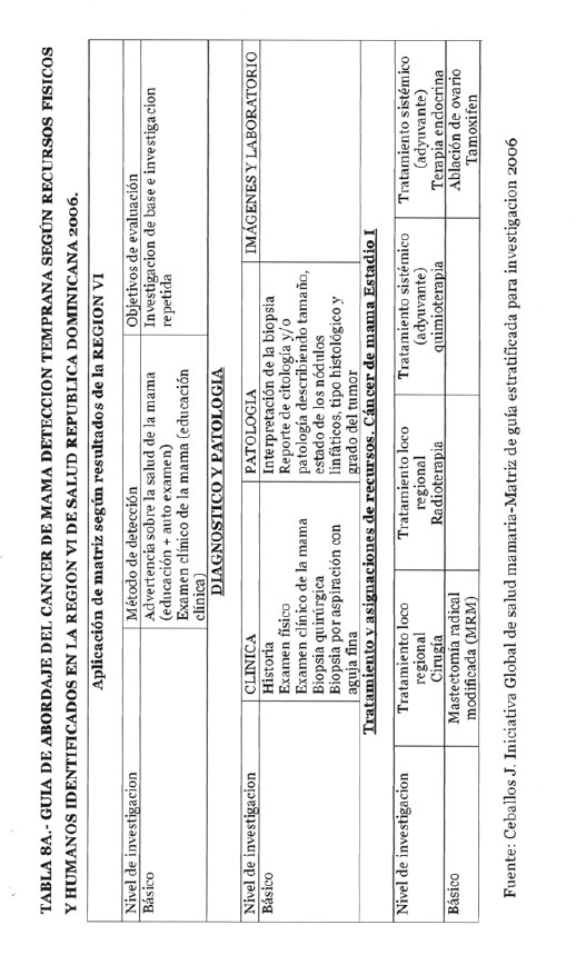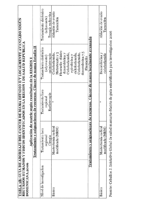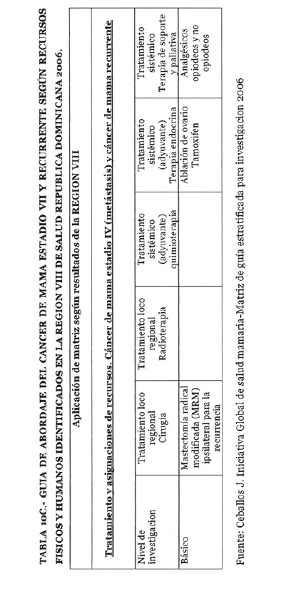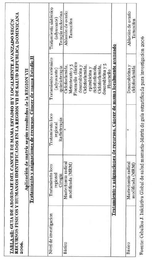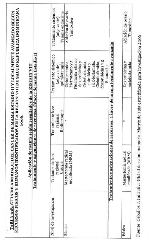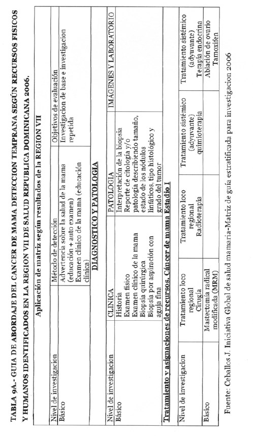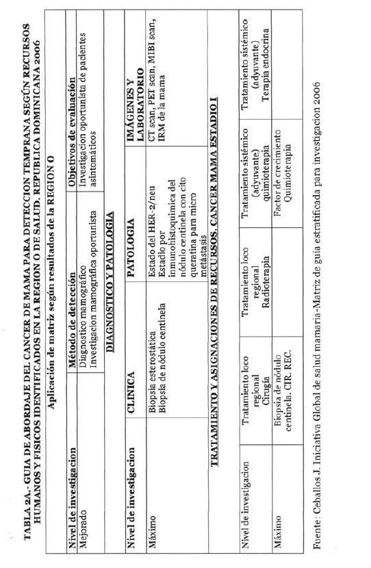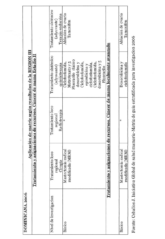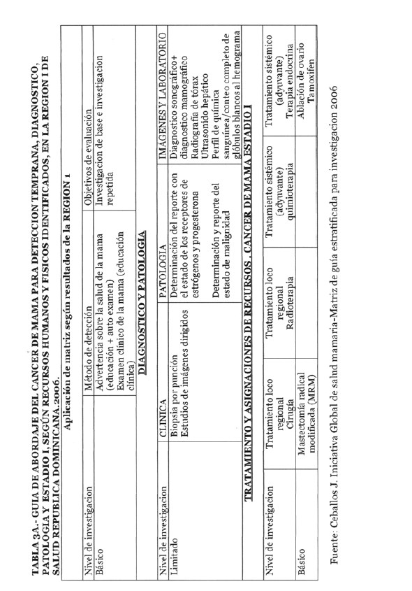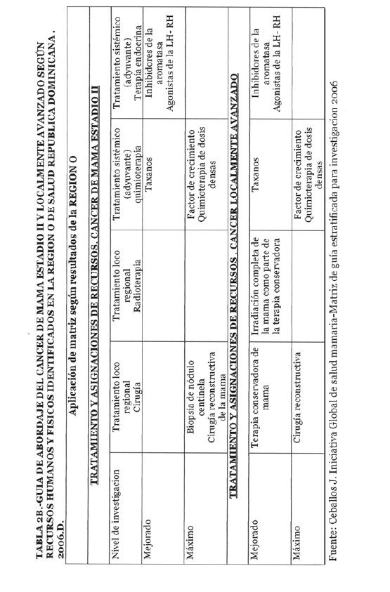 Se incorporan datos de levantamiento en una matriz dada, que permiten definir el tipo de manejo posible a adoptar dependiendo de los recursos físicos y humanos de que se dispone, amparados en las guías de atención para cáncer de mama definidas por Las Normas Internacionales de Salud de Mama (BHGI) y auspiciadas por la Organización Mundial de la Salud , con el Co‐patrocinio del Fred Hutchinson Cáncer Research Center (FHCRC) Seatle, Washintong y Susan G. Komen Breast Cáncer Foundation Dallas, Texas.