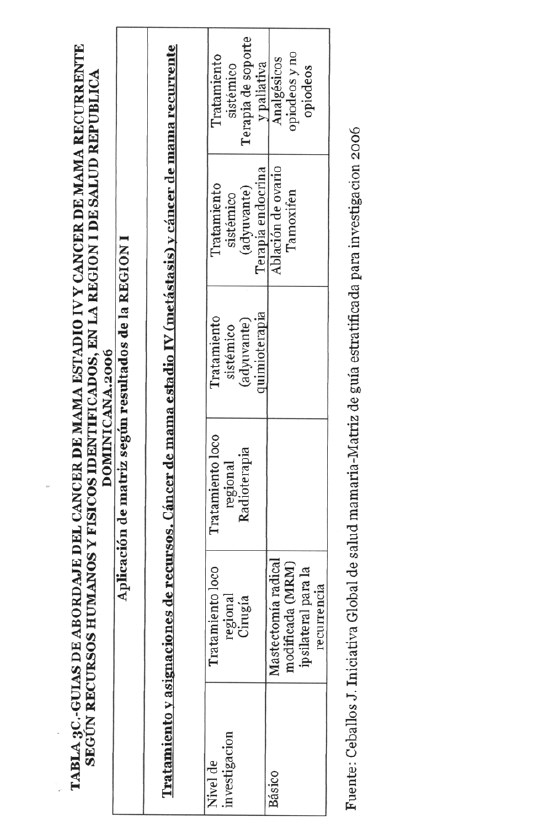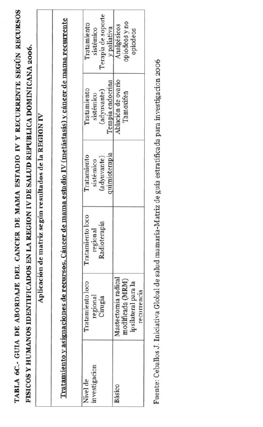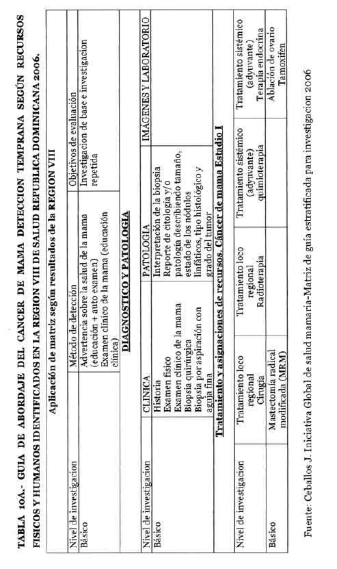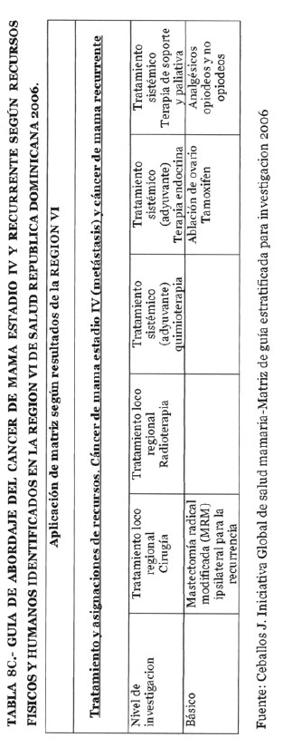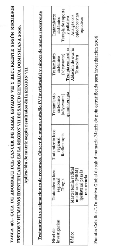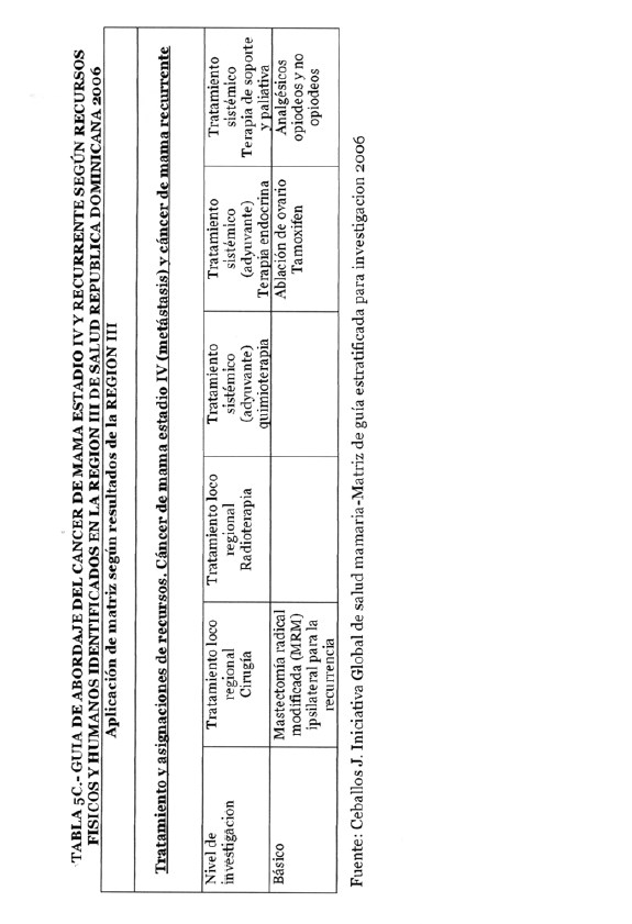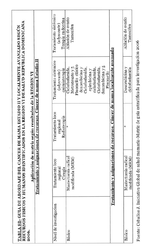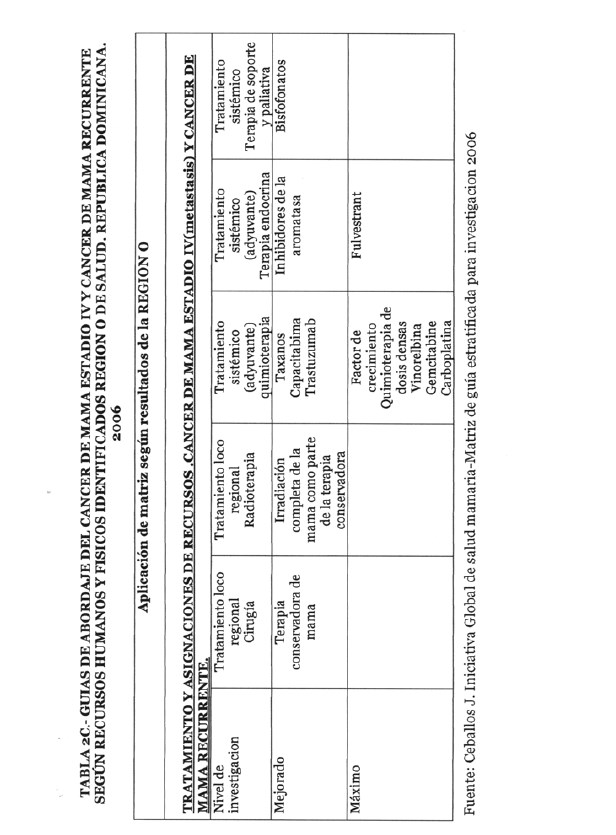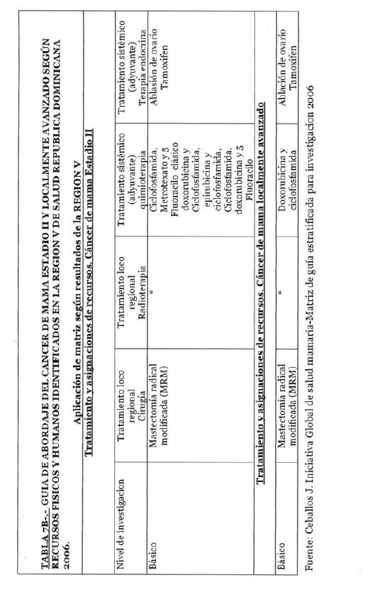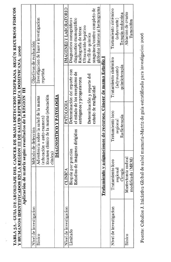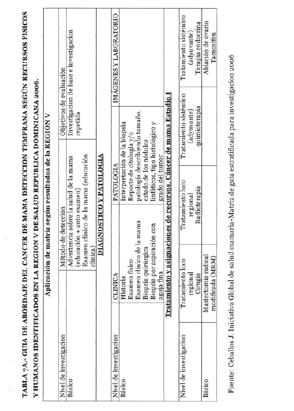 Se incorporan datos de levantamiento en una matriz dada, que permiten definir el tipo de manejo posible a adoptar dependiendo de los recursos físicos y humanos de que se dispone, amparados en las guías de atención para cáncer de mama definidas por Las Normas Internacionales de Salud de Mama (BHGI) y auspiciadas por la Organización Mundial de la Salud , con el Co‐patrocinio del Fred Hutchinson Cáncer Research Center (FHCRC) Seatle, Washintong y Susan G. Komen Breast Cáncer Foundation Dallas, Texas.