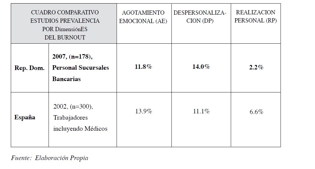 En cuanto a la prevalencia encontrada en las tres dimensiónes del burnout, en los prestatarios de servicios bancarios estas resultaron superiores en la Despersonalización, similares en el Agotamiento Emocional y significativamente inferiores en la Baja Realización Personal.