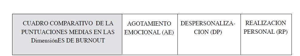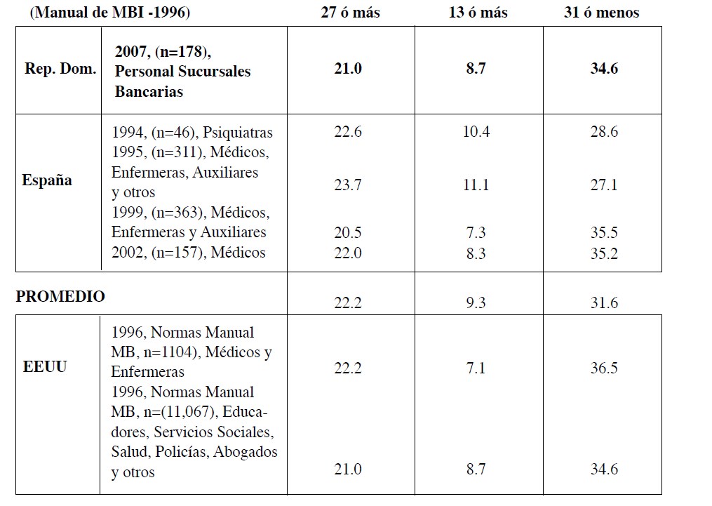 En los resultados del presente estudio se obtuvieron puntuaciones medias en las tres dimensiónes del burnout similares a la de estudios previos en servicios asistenciales de salud en España. También resultaron similares a las normas del MBI en EEUU para servicios asistenciales de salud, e idénticos a las normas para Educadores, Servicios Sociales, Salud, Policías, Abogados y otros.