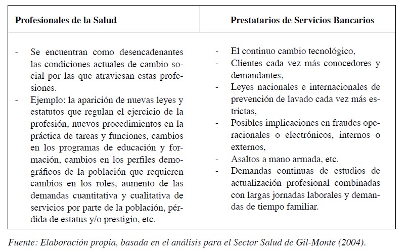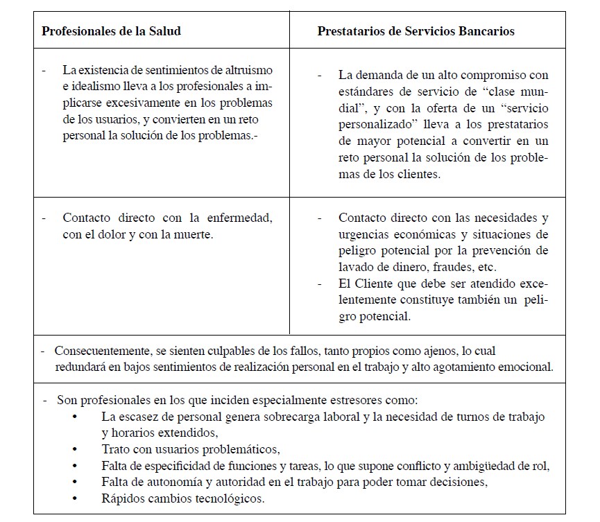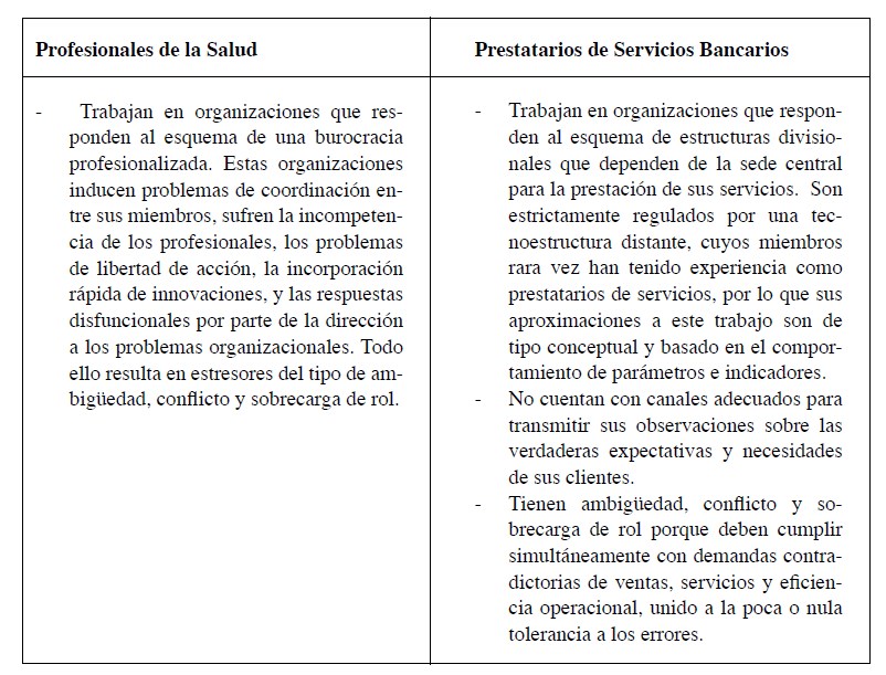 Especulamos que la prestación personal de servicios en general, y de servicios bancarios en particular, genera un nivel de estrés similar, aunque quizás en grado diferente, al generado en la prestación de servicios asistenciales. Consideramos que son muchas las similitudes en las condiciones manejadas por cualquier prestatario de servicios, aunque reconocemos que en los servicios asistenciales se impacta la vida de los “pacientes”, “educandos” y “acusados” en forma más holística que en los servicios a clientes de organizaciones comerciales.