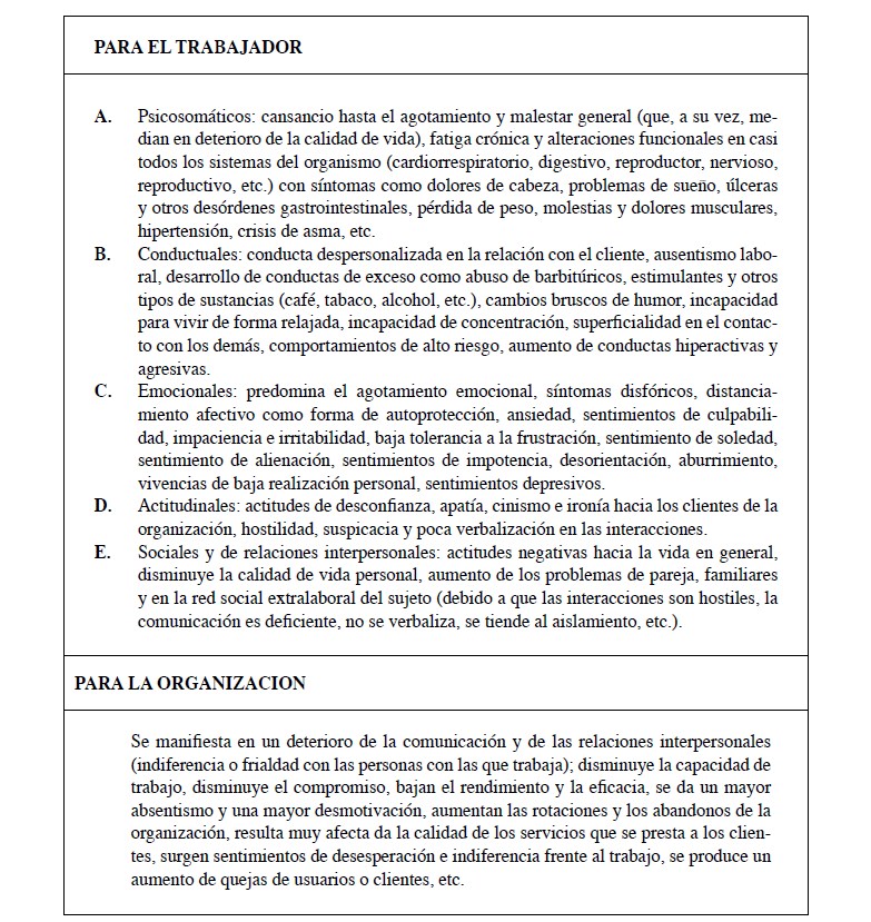 En la misma publicación se indica que “los síntomas que se producen en el SQT son indicadores de que se puede hacer visible la exposición a factores de riesgo cuando ya están actuando sobre el trabajador de un modo nocivo. Como consecuencia de una exposición a factores de riesgo que producen un SQT, los síntomas aparecen en el individuo en cantidades diferentes, de mayor porcentaje (80%, ansiedad) a menor (22%, la indiferencia): ansiedad, irritación, tristeza, inadecuación, impotencia, fatiga, inquietud, dificultad de concentración, frustración, depresión, incompetencia, sentimientos de culpa, excesivas horas de trabajo, poca realización personal, disminución de interés por el trabajo, sentimiento de inutilidad, negatividad, disminución de la motivación, disminución de intereses extralaborales e indiferencia” (INSHT, NTP-705, 2006).