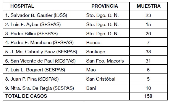 Este es un estudio epidemiológico, descriptivo y multicéntrico, realizado en una muestra de 150 pacientes de ambos sexos, mayores de 20 años de edad, ingresados en 9 hospitales públicos de la ciudad de Santo Domingo y de algunas provincias seleccionadas. La muestra representó un 20% o más de las camas disponibles en los diferentes centros de salud, según vemos en la tabla siguiente: