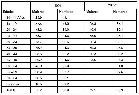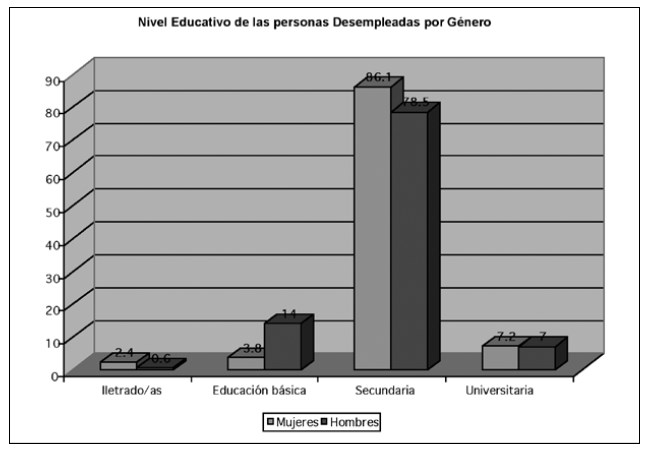 Estos datos confirman también una tasa de desocupación mayor para las mujeres que para los hombres, como lo registró la ENDESA de 1996 donde los hombres desocupados son el 19.3%, en tanto las mujeres alcanzaban el 58.0%, es decir que existe una relación aproximada de tres mujeres desempleadas por cada hombre en la misma situación. También la tasa de desocupación varia de acuerdo a los grupos de edad, como se presenta a continuación.