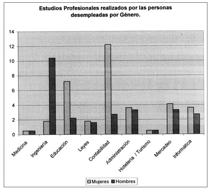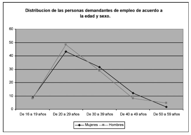 Sin embargo, las mujeres desempleadas ocupan una proporción mayor que los hombres en los grupos de 30 a 39 y de 40 a 49 años, para caer por debajo de la proporción masculina después de esta edad. Estos datos parecen confirmar que las mujeres adultas tienen mas dificultad para obtener trabajo que los hombres. Algunas variables como la responsabilidad por la prole, el trabajo domestico, el cuidado de familiares reducen las posibilidades de las mujeres para obtener empleo, tanto porque ellas mismas tienen limitaciones para aceptar horarios muy estrictos o porque tienen reducida su movilidad. Pero también las empresas son selectivas y tampoco están dispuestas a aceptar mujeres que tienen muchas responsabilidades familiares que pudieran limitar sus capacidades para realizar el trabajo que se espera. En la experiencia del CCEVJ las empresas que buscaban personal tenían prejuicio contra las mujeres de mas de veinticinco años para puestos de servicios a clientes.