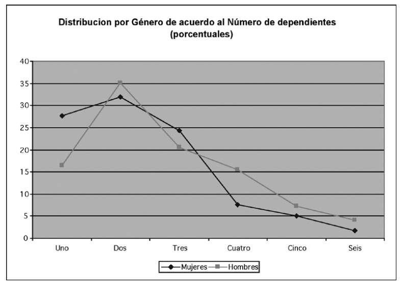 Del total de las personas solicitantes de empleos había más mujeres con personas dependientes o cargas familiares (55.0%) que hombres (45.0%), congruente con el alto porcentaje de mujeres jefas de hogar identificadas anteriormente, lo que añade a las mujeres una causa mas de presión para encontrar trabajo en el mercado. En general, el número promedio de personas dependientes es de 2.6%, casi tres personas similar al tamaño de los hogares de 3.9 personas identificados por ENDESA 2002 para la población del Distrito Nacional. Como se observa en el gráfico siguiente, las mujeres tenían una carga familiar menor que los hombres porque generalmente las familias que corresponde a mujeres jefas de hogar hay una sóla persona adulta, mientras los hogares con jefe de hogar masculino generalmente hay dos personas adultas.