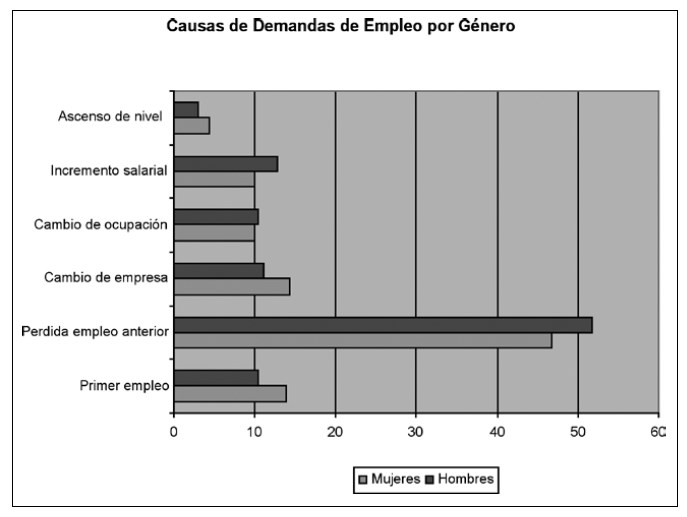 b) Estas informaciones reflejan comportamientos distintos entre las mujeres y los hombres, ya que mayor proporción de hombres había perdido su empleo anterior (51.7%) a diferencia de una proporción menor de las mujeres (46.8%). Del mismo modo, mayor proporción de hombres buscaba un incremento salarial (12.8%) que de mujeres (9.9%); y más hombres aspiraban a un cambio de ocupación (10.5%) que las mujeres (9.9%) Este comportamiento se podría interpretar como una mayor beligerancia de los hombres en el mercado de trabajo, de obtener lo que desean, de buscárselas.