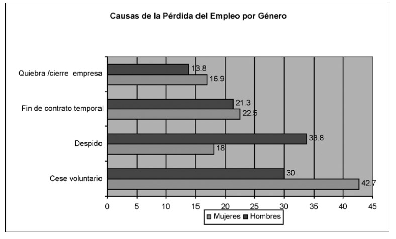 También un ligero número mayor de mujeres (22.5%) expresó como causa de la pérdida de su empleo anterior el fin del contrato temporal, en cambio de un número de hombres ligeramente menor (21.3%). Se ha registrado un mayor número de mujeres con trabajos temporales, especialmente las casadas, en tanto esta forma de trabajo les permite mayor flexibilidad en horarios y tiempo, y por ende, pueden así dedicar más tiempo al cuidado de la familia y los hijos/as. Sin embargo, esta modalidad de trabajo tiene seria limitaciones para las mujeres, especialmente en el ámbito de la promoción profesional y de las remuneraciones, contribuyendo de esta forma a mantener a las mujeres en puestos subordinados y sin posibilidad de obtener ascenso y mejores sueldos.