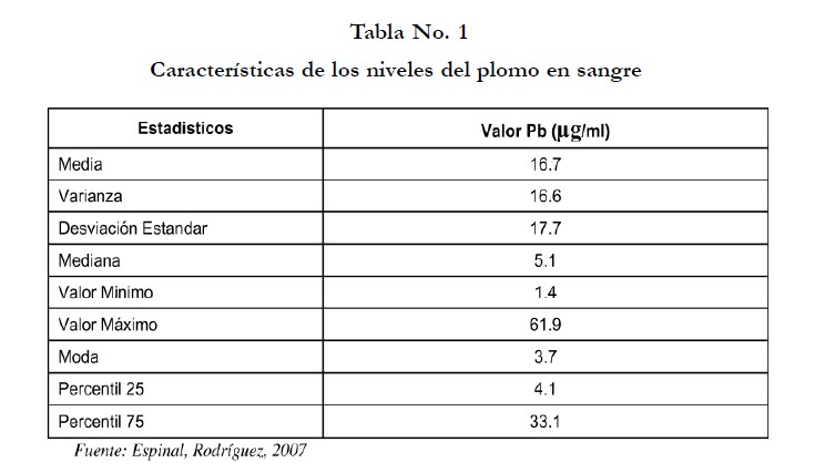 Para el análisis de los datos y para hacer comparables los resultados con otros estudios, se distribuyeron los niños en dos grupos: los que tenían valores de plomo en sangre por debajo de 10 μg/dl y otro grupo con valores de plomo en sangre por encima de 10 μg/dl de acuerdo a la última clasificación del CDC. Se realizó determinación de la media aritmética, desviación estándar, error estándar, y varianza, de los valores de plomo en sangre.