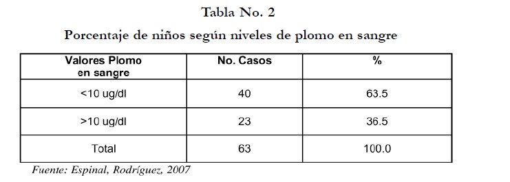 En la Tabla No. 2 se visualiza que de acuerdo a la clasificación realizada el 36.5% (23) de los niños tenía niveles elevados de plomo en sangre. Valor por encima de lo esperado para este estudio (35%).